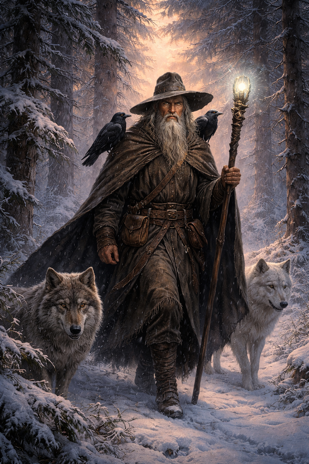Odín es el caminante. Aparece en muchos relatos recorriendo los mundos disfrazado de anciano, poniendo a prueba la hospitalidad humana, observando, aprendiendo, preguntando. En numerosas historias se le describe solo, errante, apoyado en su bastón, siempre en tránsito. No busca comodidad, busca comprensión.
